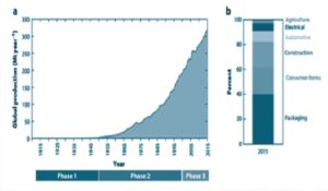 شکل ۱- روال تولید پلاستیک در جهان، a)تولید جهانی پلاستیک بر حسب میلیونتن متریک در سال b) الگوی مصرف پلاستیک در سال ۲۰۱۶ ، سه فاز مشاهده شده از قرار زیر هستند: فاز یک، فاز تولید آهسته و کشف بسیاری از پلاستیکهایی که امروزه مصرف میشوند. فاز دو، نشاندهندۀ گسترش سریع جهانی و رشد تولید و فاز سه رشد خطی تولیدپلاستیک که متأثر از رشد اقتصاد جهانی است را نشان میدهد.